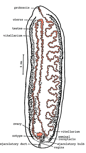 Figure 1. Adult Amphilina japonica. Note vaginal and male pores close together at posterior end, and restriction of testes to lateral fields. According to Dubinina (1962), redrawn from Dubinina (1982).