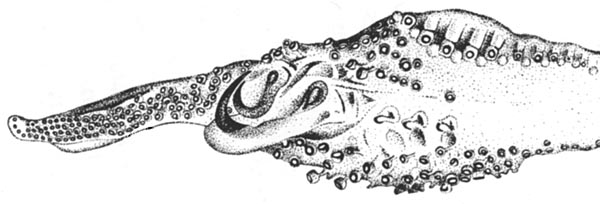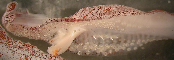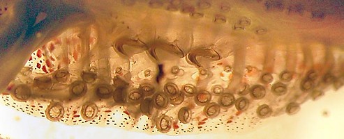 Figure. Oral view of the proximal hooks of the medial zone and suckers of the ventral-marginal zone of the club of G. fabricii, fresh. Photograph by M. Vecchione with transmitted light taken aboard the R/V G. O. SARS during the MARECO cruise to the central North Atlantic