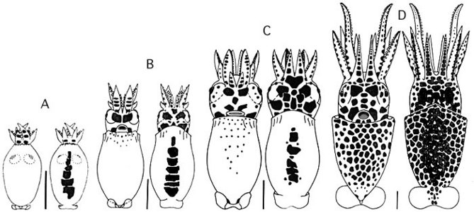 Figure. Ventral and dorsal views of paralarvae and an early juvenile of Onykia sp. A - 1.7 mm ML paralarva. B - 2.7 mm ML paralarva. C - 3.4 mm ML paralarva. D - 5.6 mm ML juvenile. A-C show paralarvae with contracted anterior mantle margins which are commonly observed in preserved paralarvae. These growth stages were taken from plankton tows in Hawaiian waters. The scale bar is 1 mm. Drawings by R. Young.