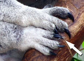 The hand (top) and foot (bottom) of a koala (Phascolarctos cinereus). Note how the syndactylous foot has the 2nd and 3rd digits fused together, but with two separate claws (arrow). Image © 2007 Sanjay ach